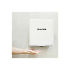 The Alpine Industries Willow Commercial White High Speed Automatic Electric Hand Dryer is a high speed automatic hand dryer with a unique design offering a blue light for hand drying efficiency, HEPA filter to clean bacteria from intake air and is even equipped with a heat and speed control. With a less than 4 in. D, this hand dryer is ADA compliant without the need of a recess kit and with a powerful 32000 RPM motor, the Willow model will dry your hands in 10-seconds, faster than many comparable high speed hand dryers and excellent for high traffic bathroom areas. Saving thousands of dollars per year in paper towels and electricity, the Willow hand dryer is also equipped with a plug-in option for quick and easy installation. Hand dryer automatically activates when hands are placed beneath the sensor and stops when they are removed. Also features auto-stop function if hands are not removed after 63-seconds. High-Quality Construction: Built for long-term use, Alpine’s Willow High-Speed Commercial Hand Dryer is expertly crafted out of durable stainless steel which can be easily wiped down to preserve the appearance and cleanliness of your restroom facilities. Commercial Hand Dryer: With advanced state-of-the-art features, the Alpine is a great solution for hand drying in restrooms of offices, malls, rest stops, restaurants and other commercial establishments. Extraordinary Quality: The Alpine Willow boasts a powerful 32,000 RPM motor, taking only eight seconds to dry hands. A replaceable HEPA filter removes dirt from the air used to dry hands, helping to keep the motor and other parts clean for extended use. Easy Operation: Simply place your hands beneath the sensor to activate. The High-Speed Automatic Hand Dryer also features a blue light for hand drying efficiency, heat and speed controls, and an auto-stop function if hands aren’t removed after 63 seconds. ADA Compliant: Measuring 12.63″ H x 11.25″ W x 3.93″ D in size, this Commercial Hand Dryer complies with…
