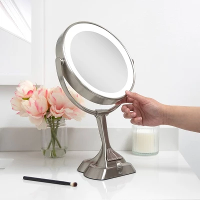 Zadro’s 10’’ Round 3-Way LED Rotating Mirror gives endless options for creating the best beauty looks in any lighting. Dual 10X/1X magnification and optical quality glass gives crystal clear viewing of your entire face and hair. The ultra-bright LED lighting features three adaptive color settings of Daylight (natural sunlight), Office (cool white) and Evening (warm white), so you can create color-correct makeup looks depending on where you’ll be going. Use the multi-functional Smart Dimmer control pad to fully adjust the light’s brightness and switch between each lighting color, then effortlessly switch between each magnification side using the 360-degree endless mirror head rotation.