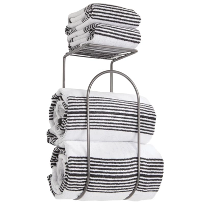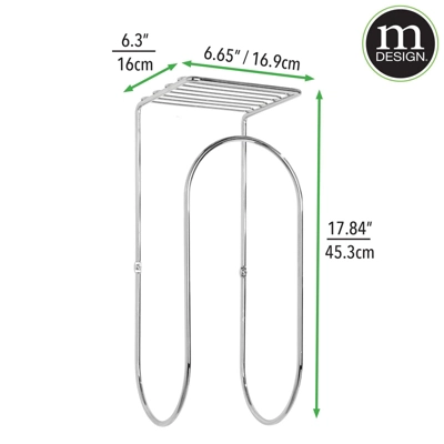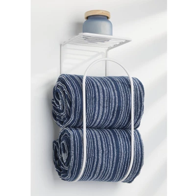 The mDesign Decorative Wall Mount Towel Holder will ensure that towels are always at your fingertips in the bathroom or anywhere in the home. The stylish curves of this holder add a modern look to any bathroom motif, while its open design keeps towels at the ready for you or your guests. Towels of all sizes easily fit into the holder, just roll them to fit; Use the top shelf to neatly stack smaller face or hand towels or use it to display decorative soaps or additional toiletries. The holder easily installs with the included hardware. mDesign – more calm, less clutter