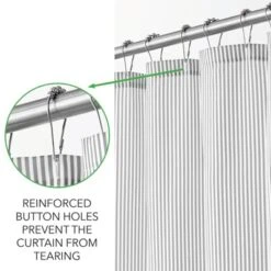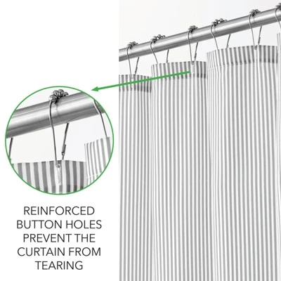 Keep your bathroom clean and dry with this easy-care, polyester shower curtain from mDesign. Strong reinforced buttonholes make hanging the curtain easy. Pair with one of mDesign’s shower curtain liners to ensure your bathroom floor stays nice and dry. This curtain is functional and stylish and helps to keep water in the shower or tub and not on your floor!