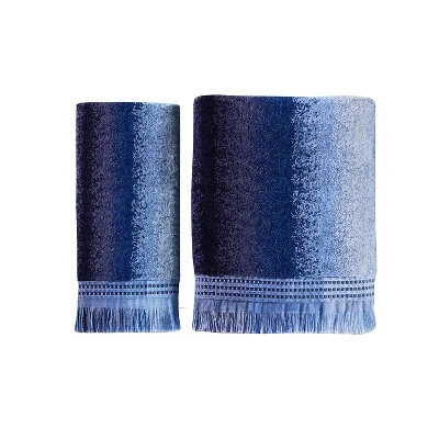 - Varying shades of blue in an ombre striped pattern with frayed trim